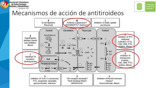 Su mecanismo de acción es inhibiendo el acoplamiento de yodotironinas y por lo tanto reducen la síntesis de hormonas tiroideas, también inhiben la función de la tioperoxidasa, reduciendo la oxidación y organificación del yoduro, están indicados como terapia de primera línea y particularmente en los más jóvenes y previo a los que se realizara radioterapia o tiroidectomía.